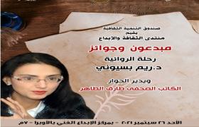 المنتدي إشراف الكاتب الصحفي طارق الطاهر، وتروي خلال الندوة الكاتبة د. ريم بسيوني رحلتها الإبداعية وحصولها علي عدد من الجوائز، وكذلك رحلتها الأكاديمية من خلال التدريس في عدد من الجامعات في مصر وخارجها .