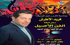 إحتفالا بذكرى رحيل الموسيقار فريد الاطرش .. يقيم مركز إبداع قصر الامير طاز –بشارع السيوفية بالسيدة زينب-التابع لقطاع صندوق التنمية الثقافية برئاسة أ.د. وليد قانوش، بالتعاون مع جمعية محبى الموسيقار "فريد الأطرش" برئاسة الاستاذ عادل السيد حفل جديد لفرقة "الفن الأصيل" ، وذلك فى السادسة مساء الثلاثاء (26 ديسمبر) .