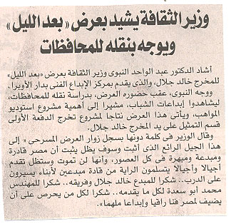 وزير الثقافة يشيد بعرض " بعد الليل" ويوجه بنقله للمحافظات